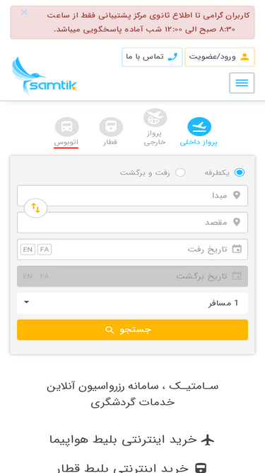 59%سامتیک، با پیاده سازی بستری کاربر پسند و ساده و با ارائه خدمات با کیفیت در زمینه مسافرت هوایی و ریلی به شما کمک می کند با یک جستجوی ساده بلیط هواپیما و یا بلیط قطار مورد نظر خود را انتخاب و خریداری نمایید.