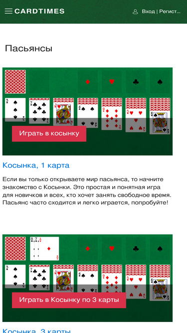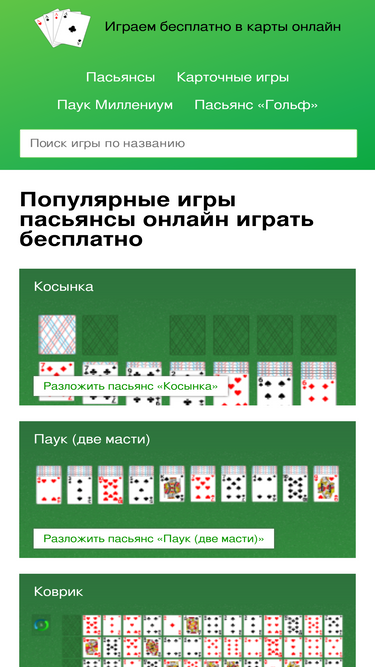 играть онлайн в карты пасьянс, без регистрации, совершенно бесплатно без пароля и логина. можно играть на компьютере и телефоне в популярные карточные игры пасьянсы: косынка, дурак, паук и коврик.