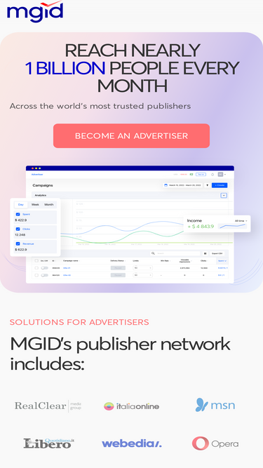 87%Advertise on MGID Publishers Network and get targeted engaged audience. Leading Native Advertising Solutions for Advertisers and buyers that offers high quality and high performance results. Start Now