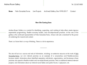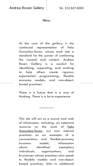 77%At the core of the gallery is the continued representation of Felix Gonzalez-Torres, whose work sets a standard for the power of combining the visceral and content. Andrea Rosen Gallery is a conduit for identifying, supporting, and working to help others create rigorous experiential programming, flexible economy models, and non-object-based practices. There is a future that is a way of thinking. There is a lot to experience. -- This site will act as a source and web of information, including: an extensive resource on the work of Felix Gonzalez-Torres; our own internal practices as an example of a conscientious and flexible-economy business model; information about identified exemplary individuals, organizations, and businesses whose practices also speak to flexible models and non-object-based practices; links to additional external relevant projects; and information about our internal round tables and public forums / symposium, etc.