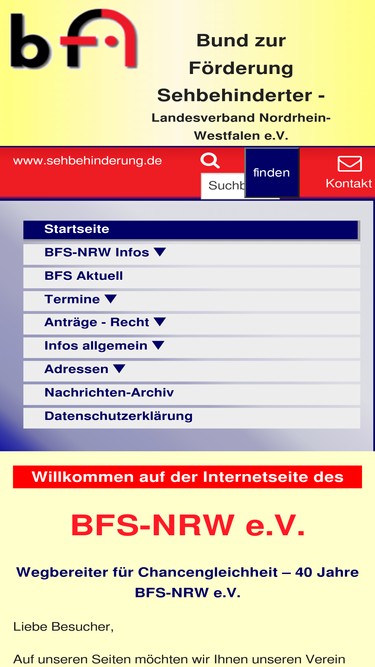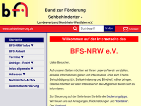 76%diese website des bunds zur förderung sehbehinderter - landesverband nordrhein-westfalen e.v. (bfs-nrw e.v.) informiert menschen mit sehbehinderung, ihre angehörigen, interessierte und förderer des vereins über alle vereins relevanten daten, ansprechpartner, satzung, aktivitäten und ortsgruppen, bietet ein diskussions-forum und gibt wietere informationen und links zu themen rund um das thema "sehbehinderung". der verein spezialisiert sich nicht auf eine bestimmte gruppe von menschen mit einer bestimmten seheinschränkung, sondern ist für alle offen, auch in bezug auf alter und lebensabschnitt (kinder, jugendliche, schüler, auszubildende, berufstätige, rentner, senioren) und aktivitäten (alltagsleben, freizeit, sport, hilfsmittel- udn computernutzung usw.).