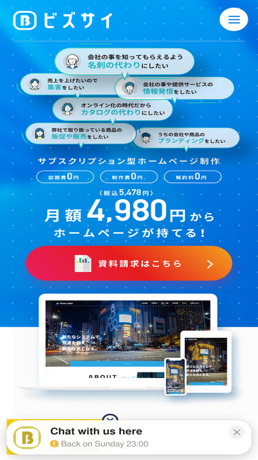 77%初期費・製作費・解約費0円、月額5,478円(税込)から始められるサブスク型ホームページ制作!他社にはないSEO対策力と完全オリジナルデザインによる集客力を実感できます。