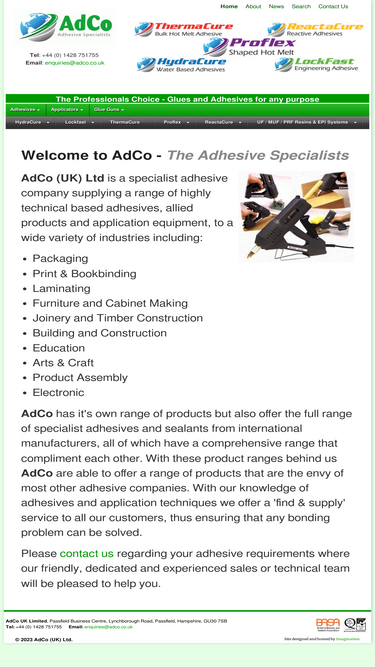 100%Order online direct from AdCo UK Limited. For All your adhesives contact the Adhesive Specialist. HydraCure - Water Based Adhesive ProFlex - Hot Melt Adhesive LockFast - Engineering Adhesives ReactaCure - Reactive Adhesives TheraCure - Bulk Hot Melt Adhesives Over 2500 products in stock.