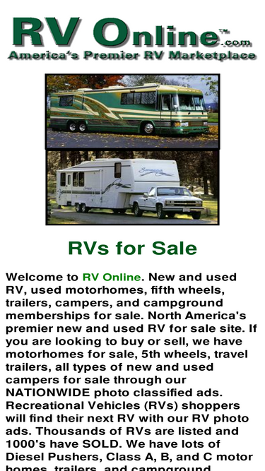 59%Used RV for sale. Buy or Sell RV Motorhomes, Used Campers, Travel Trailers, Fifth Wheels, New and Used RV for sale at RV Online.