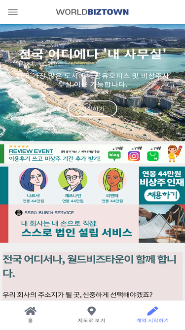 45%월드비즈타운 , 전국 소도시 및 외지 전문 비상주사무실, 공유오피스 월드비즈타운입니다. 소호사무실, 비상주사무실, 공유오피스, 공유사무실은 월드비즈타운! 1년 33만원 혹은 44만원부터 시작합니다. 계약기간이 길수록 할인율이 올라갑니다. 비상주사무실로 고정비 월세 부담 없이 사업을 시작하세요!