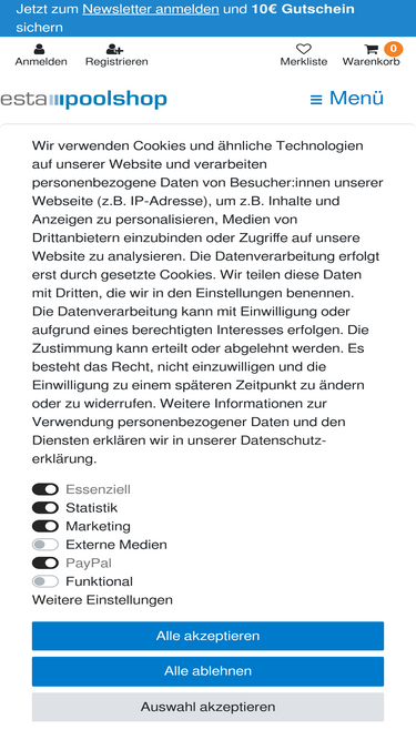 46%Für die optimale Pflege und Wirkung der Pooldesinfektion ist eine wöchentliche Überprüfung der Wasserwerte notwendig. Mit diesem klassischen Schütteltester lassen sich relativ genaue Werte ermitteln. Messbereich: p H-Wert (pH) 6.8 - 8.2 (I dealwert pH 7,0 - 7,4) Chlor: 0. 1 - 6.0 (I dealwert Chlor 1 - 3 mg/l) Brom: 0,22 - 13,2 (Idealwert Brom 1 - 3 mg/l) Lieferumfang: Testbehälter (10 ml) 30 Testtabletten DPD 1 Rapid - für Chlor/Brom-Wert Messung 30 Testtabletten Phenol Red Rapid - für pH-Wert Messung Aufbewahrungsbox Anwendung: Testbehälter ohne Reinigungsmittel mit Leitungswasser gründlich reinigen/ausspülen Deckel des Testbehälters entfernen Füllen Sie den Testbehälter mit Poolwasser aus ca. 20 cm Tiefe Drücken Sie eine Testtablette Phenol Red Rapid aus dem Blister in die zweite Kammer Drücken Sie eine Testtablette DPD1 Rapid aus dem Blister in die vierte Kammer Schließen Sie den Deckel Schütteln Sie den Testbehälter, bis sich die Tabletten aufgelöst haben Vergleichen Sie die Farben in den Testkammern mit den aufgedruckten Werten, um Ihre pH- und Chlor/Brom-Werte zu ermitteln Spülen Sie danach den Testbehälter ordentlich mit Leitungswasser aus Haltbarkeit für die Tabletten mindestens 7 Jahre
