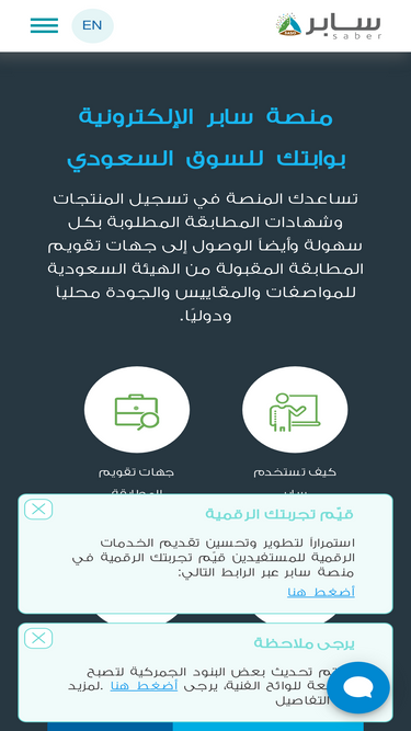 100%سابر منصة الكترونية تربط المنشأت التجارية من مستوردين أو أصحاب المصانع المحلية مع جهات تقويم المطابقة المعتمدة لاستخراج شهادة تقويم المطابقة للمنتجات المراد بيعها في السوق السعودي