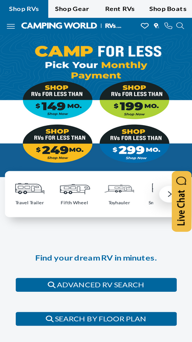 87%RVs for sale. Shop Camping World's huge selection of Travel Trailers, Fifth Wheels, Pop-Ups, Hybrids, and Motorized RVs.