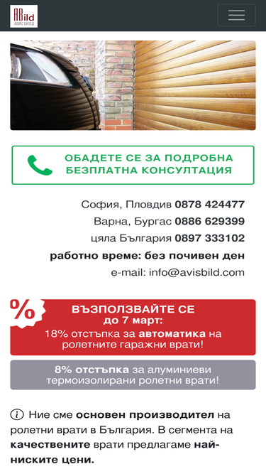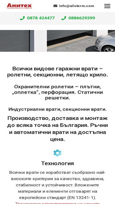 97%Ролетни гаражни врати, секционни врати, летящо крило, двукрили гаражни врати. Охранителни ролетки – плътни, „оплетка“, перфорация.
