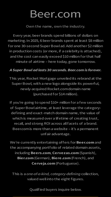58%The one and only Beer.com global domain name portfolio is now available for the right buyer!! Contact us for more information.