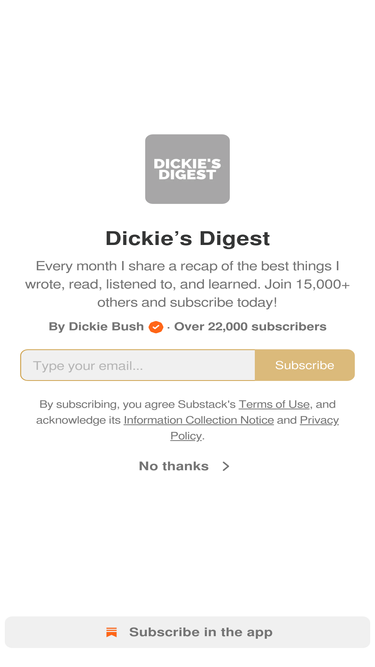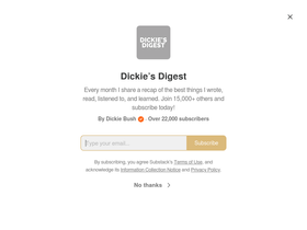 100%Every month I share a recap of the best things I wrote, read, listened to, and learned. Join 15,000+ others and subscribe today! Click to read Dickie’s Digest, by Dickie Bush, a Substack publication with tens of thousands of subscribers.