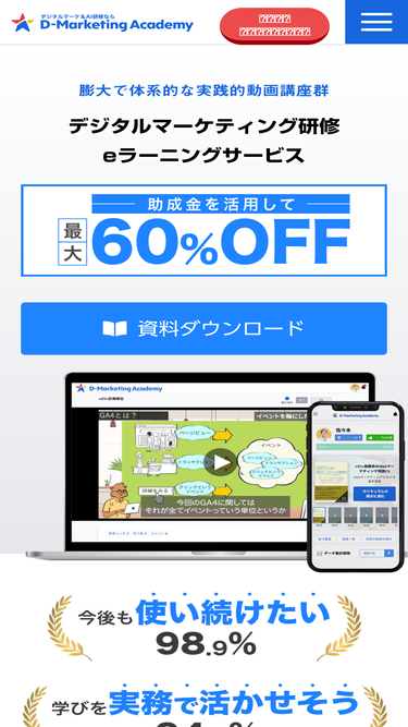 67%膨大かつ体系的な動画アニメーションeラーニングでデジタルマーケティングやAI研修を成功に導きます。チームに合わせた育成カリキュラム策定から講師によるオンラインサポートに加え、多数の学習支援・管理機能を搭載して育成をサポート。