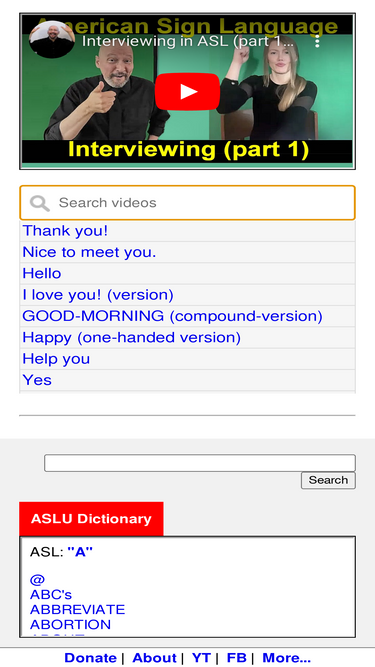 93%asl - american sign language: free, self-study sign language lessons including an asl dictionary, signing videos, a printable sign language alphabet chart (fingerspelling), deaf culture study materials, and resources to help you learn sign language. good for homeschool sign language classes, parents (baby signing), interpreters, and people who just want to learn fun asl phrases like hello, thank you, i love you, etc.