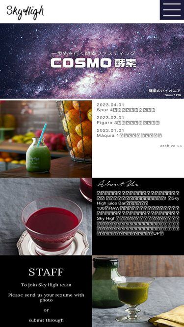 100%からだがほんとうに求めているものを満たせば、 空高く舞い上がるように心地いい! Sky High juice Barへようこそ。100%RAWのジュースが、あなたのボディ&マインドをクレンズしてヘルシーに。 無農薬や自然農法で育った野菜、果物だから、ビタミン、ミネラル、ファイトケミカル、酵素が豊富です。