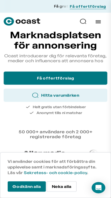 82%Ocast är en marknadsplats för mediebranschen. För annonsörer, medier och byråer. Här kan företag hitta sina nästa samarbetspartners och enkelt skapa nya samarbeten.