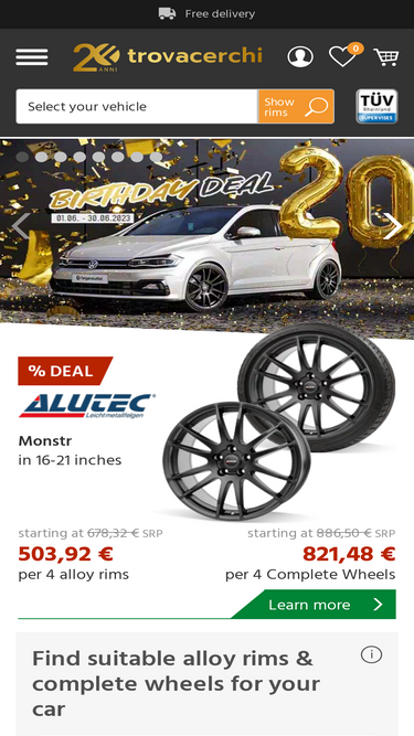 73%Discover high-quality alloy wheels, complete wheels and tires at trovacerchi – perfectly matched to your car. Combining quality, design and driving pleasure.