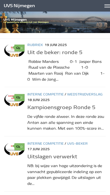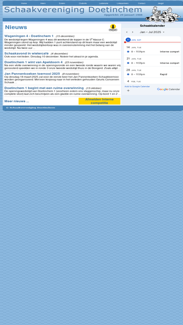 100%dit is de website van schaakvereniging doetinchem met nieuws, informatie over de vereniging en resultaten van de interne en externe competities. ook staan hier regelmatig wedstrijdverslagen van de externe competitie.