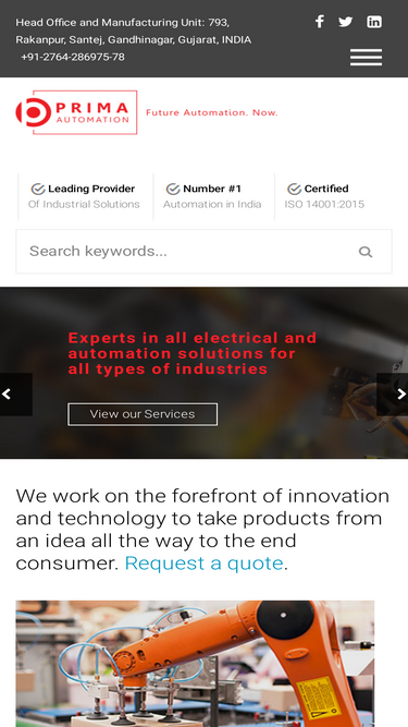 82%Manufacturing Unit : India Map Unit - I : Head Office and Manufacturing Unit Plot No-793, Rakanpur, Santej, Kalol, Gandhinagar, Gujarat, INDIA -382721 +91-2764-286975 / +91-2764-286978 +91-6354001303 (Sales Team) +91-6354901303 (Purchase Team) panels@prima-automation.com Sales Representative : Domestic West India Daman, Gujarat Mr. Vipul Panchal +919824789778 vipul.panchal@prima-automation.com South India Chennai, Tamilnadu…