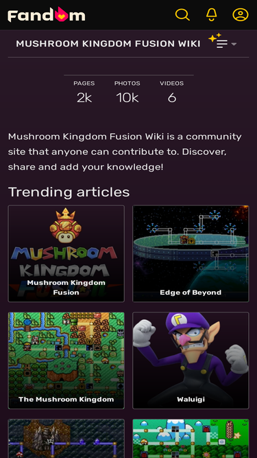 83%welcome to the mushroom kingdom fusion wiki a comprehensive compendium of all elements of this crossover fangame that anyone can edit 418 articles since may 29, 2008. contents (view all pages) game concepts characters worlds levels powerups items super mario fusion: revival - a spinoff and...