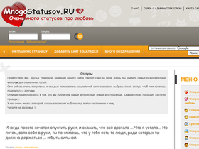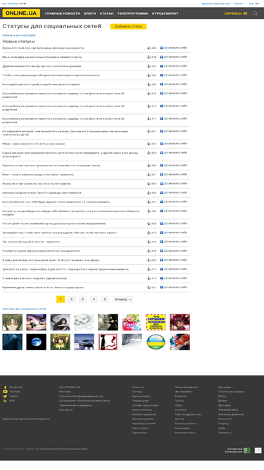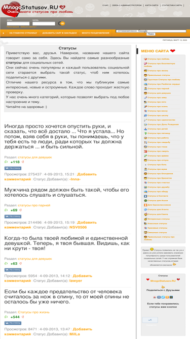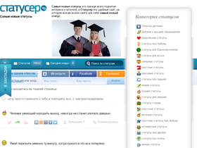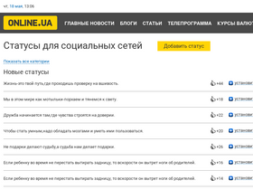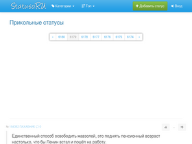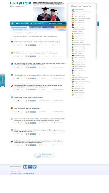 75%подборка прикольных статусов на все случаи жизни, разделённых на множество категорий. голосование пользователей сразу оценивает каждый новый статус, и определяет его позицию в рейтинге.