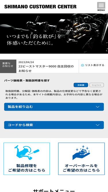 75%シマノ釣り製品をお使いのお客様総合サポート公式サイトです。修理、オーバーホール、パーツの注文、メンテナンスなどを承ります。リール、ロッド、用品など、私たちシマノカスタマーセンターは釣り具という製品を通じてあなたとご一緒したいと考えます。