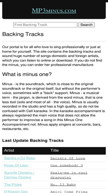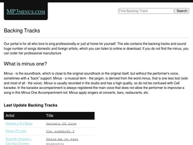 80%our portal is for all who love to sing professionally or just at home for yourself. the site contains the backing tracks and sound huge number of songs domestic and foreign artists, which you can listen to online or download. if you do not find the minus, you can order her professional manufacturewhat is minus one? minus - is the soundtrack, which is close to the original soundtrack or the original itself, but without the performer's voice, sometimes with a