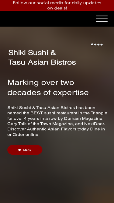 90%Welcome to Shiki & Tasu Asian Bistro, where culinary excellence meets the delights of Asian fusion! Delve into our diverse menu featuring the finest sushi, Japanese, Thai, Vietnamese, and Chinese cuisine. Offering an array of sushi, ramen, chicken, duck, beef, seafood, and more for lunch or dinner. Take-out is also available for your convenience. Join us at multiple locations! Holly Springs, NC | Apex, NC | Durham, NC | Cary, NC | Raleigh, NC.