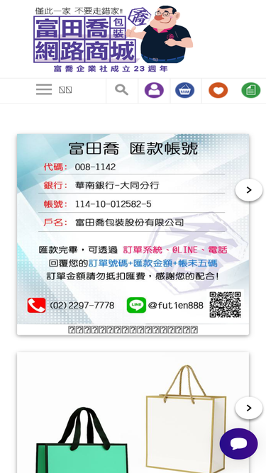 100%富田喬包裝網路商城提供24小時線上購物平台,服務品項:真空袋、鋁箔袋、各式彩藝袋、日本opp袋、紙袋、紙盒,烘焙用品和餐廳用品,產品多元化並持續更新,為您創造無限可能的包裝產品,是我們始終堅持的目標…