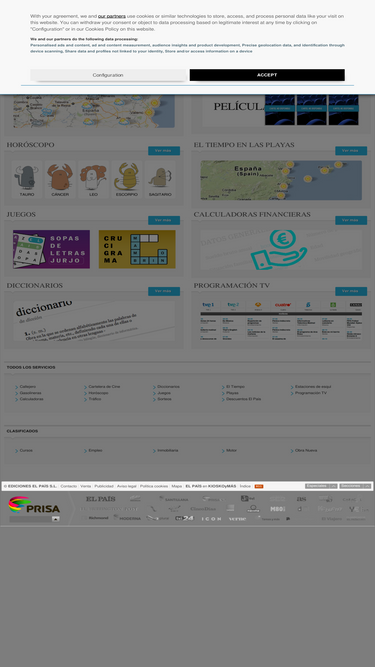 87%Conoce todos los servicios de EL PAÍS: el tiempo, el tráfico, gasolineras, callejero, cartelera de cine, juegos, horóscopo, programación TV, sorteos, diccionarios, calculadoras, páginas amarillas, los clasificados de inmobiliaria, cursos, empleo y motor y la tienda de EL PAÍS.
