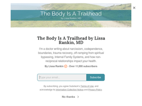 86%I'm a doctor writing about narcissism, codependence, boundaries, trauma recovery, off-ramping from spiritual bypassing, Internal Family Systems, and how non-reciprocal relationships impact your health. Click to read The Body Is A Trailhead by Lissa Rankin, MD, a Substack publication with thousands of subscribers.