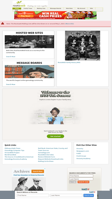 100%rootsweb - the internet's oldest and largest free genealogical community. an award winning genealogical resource with searchable databases, free web space, mailing lists, message boards, and more.