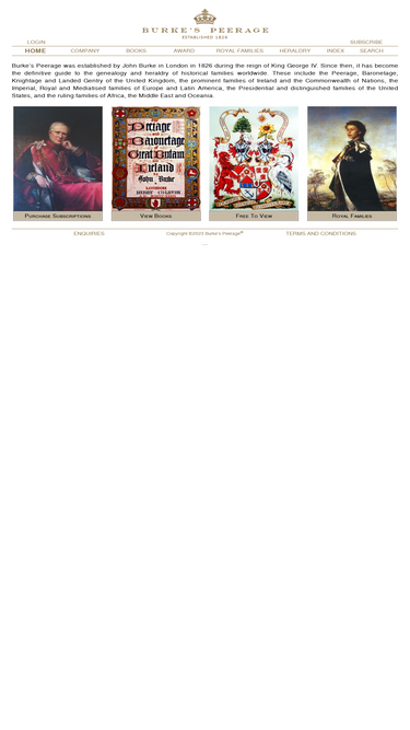 Burke’s Peerage was established by John Burke in London in 1826 during the reign of King George IV. Since then, it has become the definitive guide to the genealogy and heraldry of historical families worldwide. These include the Peerage, Baronetage, Knightage and Landed Gentry of the United Kingdom, the prominent families of Ireland and the Commonwealth of Nations, the Imperial, Royal and Mediatised families of Europe and Latin America, the Presidential and distinguished families of the United States, and the ruling families of Africa, the Middle East and Oceania.