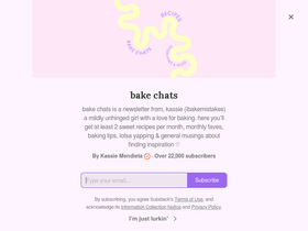 81%bake chats is a newsletter from, kassie (ibakemistakes) a mildly unhinged girl with a love for baking. here you’ll get at least 2 sweet recipes per month, monthly faves, baking tips, lotsa yapping & general musings about finding inspiration ♡. Click to read bake chats, by Kassie Mendieta, a Substack publication with tens of thousands of subscribers.