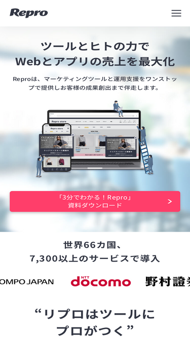 100%アプリ、Web、メール、LINE、店舗。あらゆる顧客接点で成果を生み出すマルチチャネル統合MAツール「Repro MA」とサイトスピード高速化ツール「Repro Booster」を提供しています。