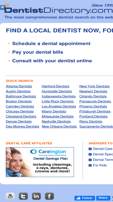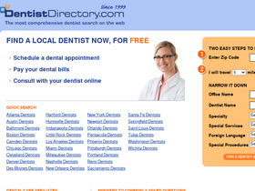 89%DentistDirectory.com is a free tool to help you find a dentist in your city and schedule an appointment. Together with DentalAppointments.com, you can find a general dentist, cosmetic dentist, family dentist or implant dentist, DentistDirectory can help you with your dental search.