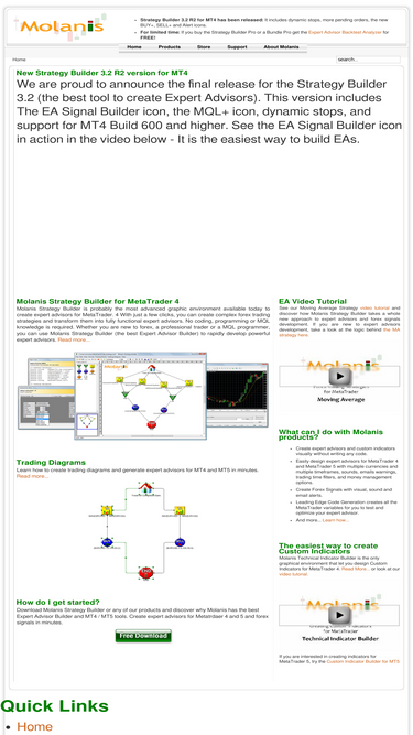 100%molanis strategy builder is a graphic environment to create expert advisors and custom indicators for metatrader. no coding, programming or mql knowledge is required.