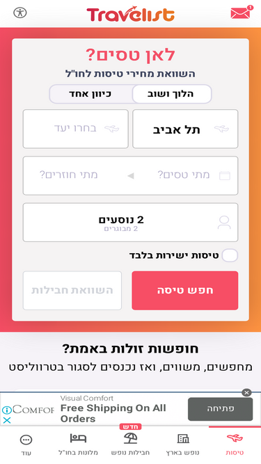 99%יוצאים לחופש ומחפשים טיסות,חבילות נופש,טיולים מאורגנים או מלונות? היכנסו לאתר גוליבר - תוכלו להזמין כרטיסי טיסה ולמצוא מגוון חבילות נופש אטרקטיביות. חופשה נעימה!