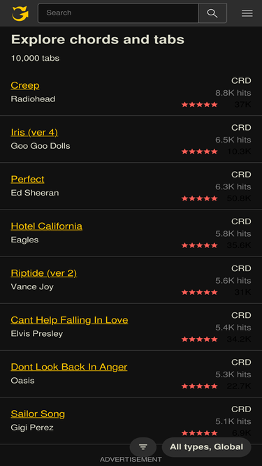 89%your #1 source for chords, guitar tabs, bass tabs, ukulele chords, guitar pro and power tabs. comprehensive tabs archive with over 1,100,000 tabs! tabs search engine, guitar lessons, gear reviews, rock news and forums!