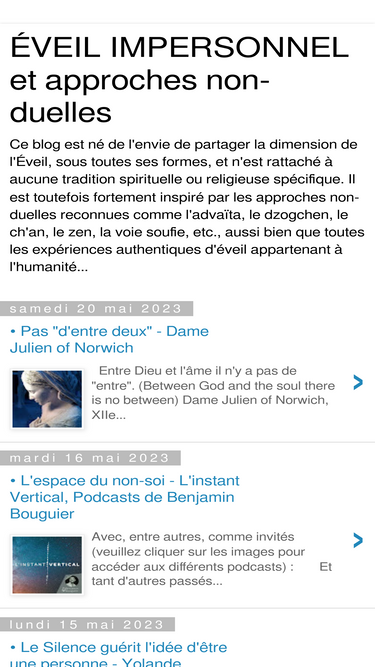 100%Ce blog est né de l'envie de partager la dimension de l'Éveil, sous toutes ses formes, et n'est rattaché à aucune tradition spirituelle ou religieuse spécifique. Il est toutefois fortement inspiré par les approches non-duelles reconnues comme l'advaïta, le mahamudra, le dzogchen, le ch'an, le zen, la voie soufie, etc., aussi bien que toutes les expériences authentiques d'éveil appartenant à l'humanité... Bienvenue !