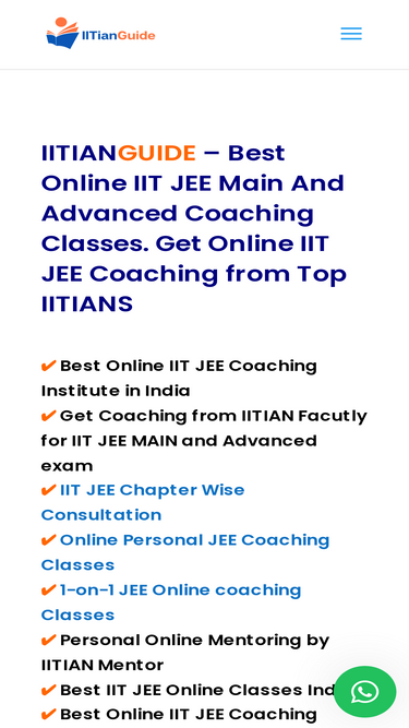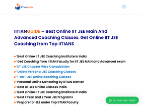 86%IITIANGUIDE is India's best online IIT JEE coaching platform. Tailored for all IIT JEE aspirants, we connect students to top IITIANS, offering an unparalleled opportunity to study from the best. Our online coaching programs, including the IIT JEE one-year, two-year, and crash courses, are meticulously crafted to ensure comprehensive preparation. Experience IIT JEE one-on-one coaching with an IITian, where individual attention helps decipher complex topics seamlessly. As the leading online IIT JEE tutor platform, we delve deep into the intricacies of IIT JEE preparation, equipping students with strategies, tips, and insights. With our dedicated JEE coaching and JEE mentoring, we aim to foster mental, emotional, and academic prowess in every aspirant connecting them to IITians. Talk to IITian for free. Choose IITIANGUIDE for the best IIT JEE online preparation and get into IIT. Enroll now and take the first step towards cracking the JEE Exam.