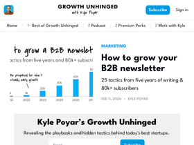 90%Revealing the playbooks and hidden tactics behind today's best startups. Join 80,000+ weekly readers for real-life growth advice, playbooks and case studies. Click to read Kyle Poyar’s Growth Unhinged, a Substack publication with tens of thousands of subscribers.