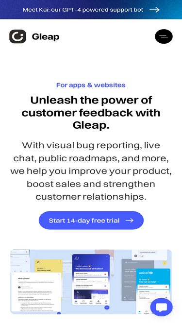 94%Gleap powers modern support workflows with AI bots, live chat, bug reporting, surveys, help centers, and product roadmapping. All built to unite teams and delight users.