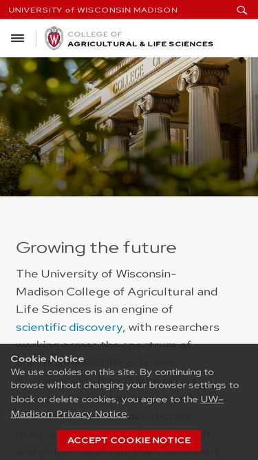 76%Growing the Future The University of Wisconsin-Madison College of Agricultural and Life Sciences is an engine of scientific discovery, with researchers working across the spectrum of agricultural and life sciences. Academically, the college offers research-based, hands-on teaching of undergraduates; world-class graduate programs rich in research and project assistantships; and short courses, workshops and other programs. Our outreach activities bring the […]