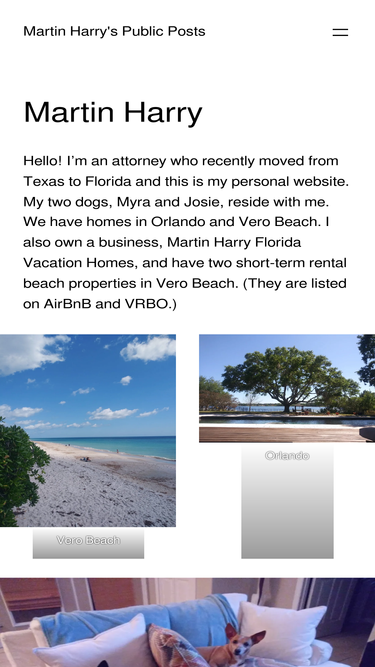 96%Hello! I’m an attorney who recently moved from Texas to Florida and this is my personal website. My two dogs, Myra and Josie, reside with me. We have homes in Orlando and Vero Beach. I also own a business, Martin Harry Florida Vacation Homes, and have two short-term rental beach properties in Vero Beach. (They […]