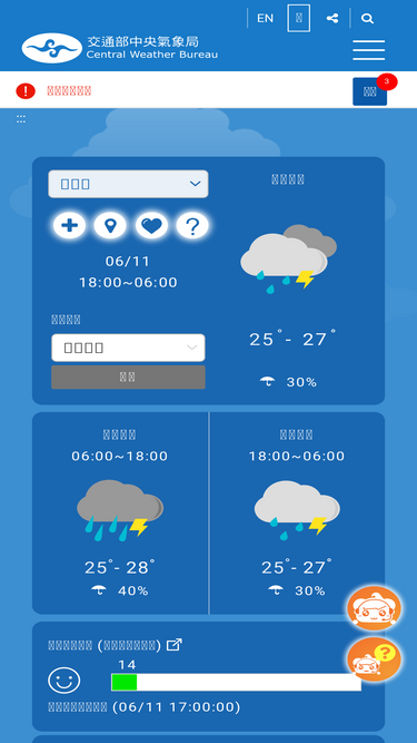 63%中央氣象署提供精緻化預報及現代化氣象觀測, 縣市天氣預報, 鄉鎮天氣預報, 各類觀測資訊, 衛星雲圖, 雷達迴波, 雨量累積, 閃電, 紫外線, ...等。