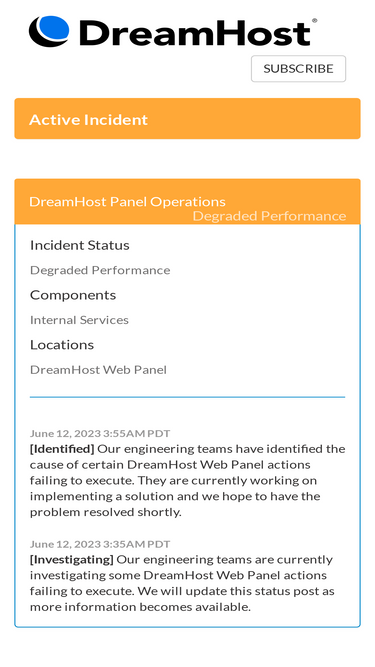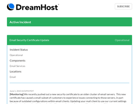 we continuously monitor the status of dreamhost and all its related services. if there are any service interruptions or maintenances, information will be available here. need help? please contact support via the dreamhost panel.