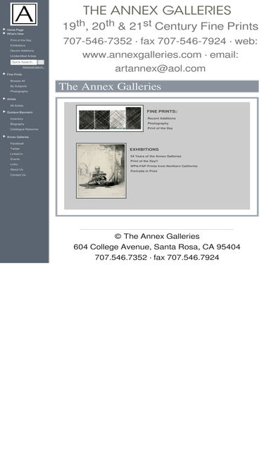 established in 1971, the annex galleries is a salon style gallery which specializes in 19th, 20th and 21st century american and european fine prints. with an inventory of over 8000 works on paper (half of which are available on this website), our focus is american color woodcut, arts and crafts prints, wpa prints, modernist and abstract expressionist prints from the 1940s and 1960s, prints created at atelier 17 in new york and paris, and california prints and printmakers.