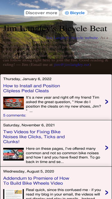 100%This blog complements Jim Langley's bicycle website. As a longtime bicycle mechanic, cycling author and former Bicycling Magazine tech editor, I get bike baskets full of email. And, whether I'm providing repair help, classic bike info, buying tips, or sharing my bike news & views, you can follow along right here to join the fun. Good reading & riding! — Jim (Email me at jim@jimlangley.net)