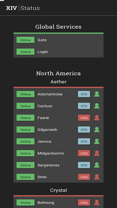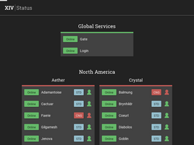 100%XIVStatus is a server status and monitoring tool for Final Fantasy XIV (FFXIV). Alongside reporting live server status, XIVStatus allows for the monitoring of server congestion levels, as well as character creation availability. Watch for changes to the FFXIV servers and get alerts sent to your desktop whenever any of these are updated in real time.