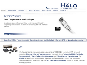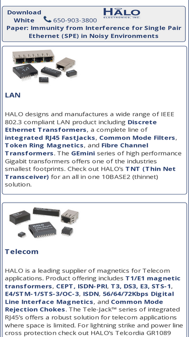 100%Download White Paper: Immunity from Interference for Single Pair Ethernet (SPE) in Noisy Environments LAN HALO designs and manufactures a wide range of IEEE 802.3 compliant LAN product including Discrete Ethernet Transformers, a complete line of integrated RJ45 FastJacks, Common Mode Filters, Token Ring Magnetics, and Fibre Channel Transformers. The GEmini series of high performance
